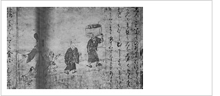 侏儒ときどき(時々)いで(出来)く、、食をこ(乞)ひて京都」をあり(歩)く、わら(童)はベシリ(後)につきて」わら(?)ひの(罵)る、みかへ(見返)りてはらだち(腹立)い(云)へどん(も)」いよいよおこ(烏滸)つきわ(?)らふ、」